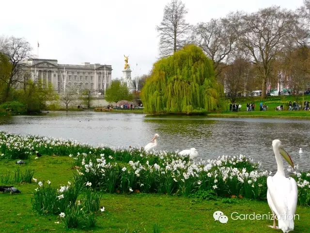 花園的美景令人贊嘆,156米長的草本花境、紫藤覆蓋的涼亭、玫瑰花園以及湖泊。建造于19世紀面積為3英畝的湖泊是花園的一大特色。4個蜂箱坐落在湖中的小島上源源不斷的為王室提供新鮮蜂蜜。還有一個高15英尺、重達20噸的大理石滑鐵盧花瓶石雕,造型很是別致。然而,白金漢宮只在每年夏季(6、7月份)的游園會上對外開放,且僅接納7000名賓客。沒機會身臨其境,就跟著小C和小A過過眼癮吧!