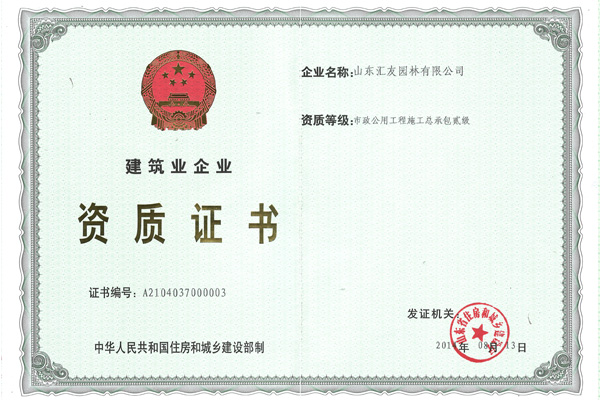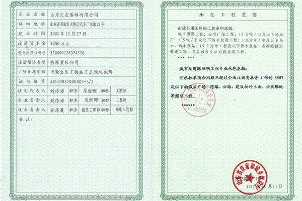 園林喜獲市政公用工程施工總承包貳級和城市道路照明工程專業(yè)承包叁級資質(zhì)