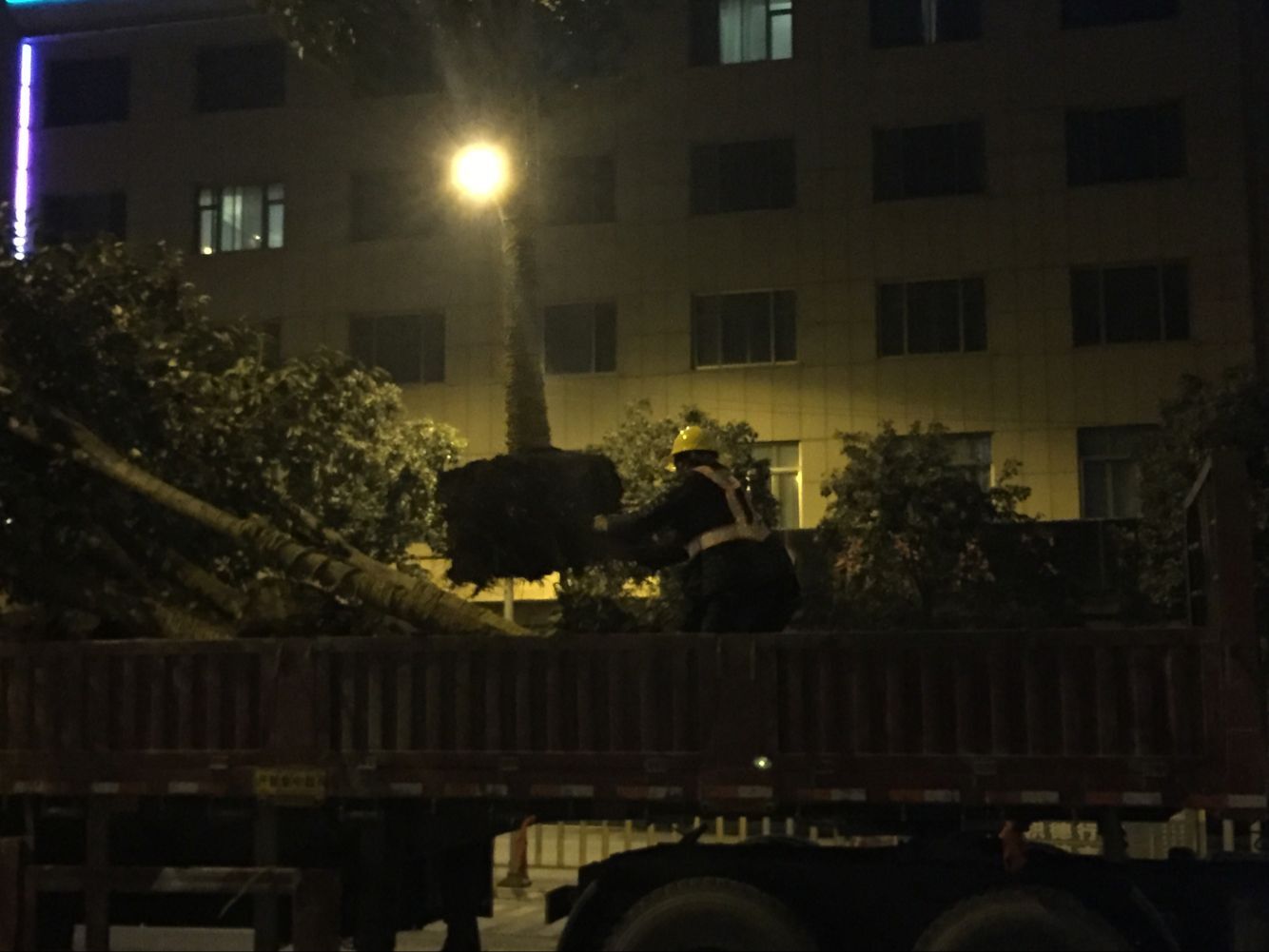 匯友市政園林集團順時安排下去,由分公司副經理王紅磊統籌安排,項目經理謝艷清進行人員調動與現場施工。接到本次任務已是下午三時,較短時間的組織機械、籌備隊伍進行工程策劃對淡季的園林公司來說比較棘手,材料設備部與安全環保部的完美配合,不到2個小時的時間機械、物資、人力都全面到位等待夜間施工的到來。