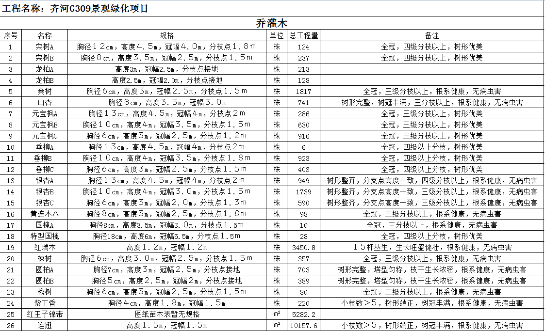 齊河G309景觀綠化工程苗木需求總量